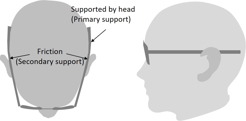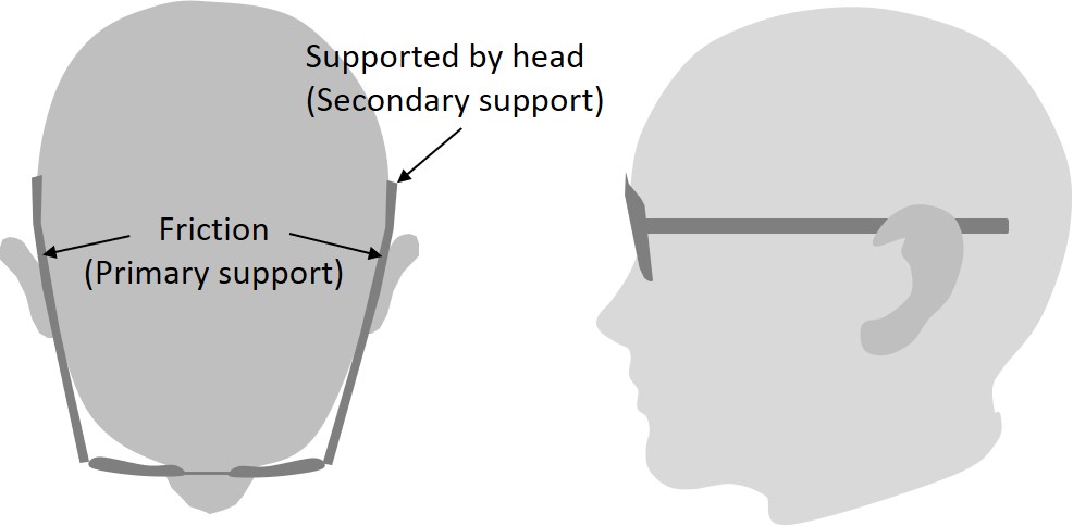The straight or library temple may use friction forces or mechanical support by user's head to hold the glasses. On sports frame, the lenses are curved such that the contour of frame is able to effectively wrap round the face. The weight of the glasses is closer to the ears so that less force is needed to support the frame. Depending on the length of the temple, the supporting mechanism is different. A shorter temple uses the force pressing against the side of the head to generate higher friction thereby holding the glasses in place. A longer temple will curve round the back of the head such that the glasses is supported by the head. There is also friction along the length of the temple to provide additional support. For prescription glasses, there is less curvature on the lens and the temple may not be able to reach the back of the head. Therefore, it relies primarily on friction to support the glasses. See figure 2 and 3 for illustrations. Straight temple design is generally not recommended for heavy prescription lens.